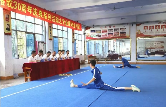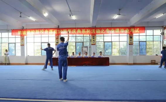 7月18日,鹅坡武校新校舍落成30周年庆典系列活动之专业课毕业考试在学校训练房隆重举行。本次考试设套路、散打两个场地,系统检验了学生基本功、拳术、器械、对练、拳击、摔跤、散打等课程的训练成果。