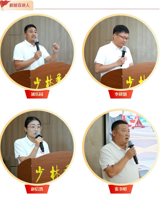 本次活动精选4位宣讲人,以多元视角勾勒鹅坡发展脉络。首讲人、鹅坡武校演艺处副主任潘乐园带来《带队出国演出,闯出寰宇新天地》,讲述鹅坡表演团出访五大洲100多个国家的历程,展现少林武术走向世界的铿锵足迹。