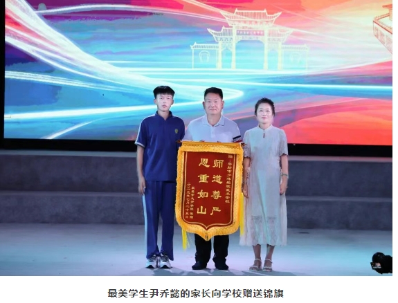 在温馨的互动环节中,最美学生刘云贺手捧鲜花走向梁校长,深情鞠躬献花,以此表达对校长谆谆教诲的感恩之情。更令人感动的是,最美学生尹乔懿的家长专程来到现场,向学校敬赠锦旗,以此感谢学校对孩子的悉心培养。暖心的互动环节将活动推向高潮,充分展现了学校师生间深厚的情谊。