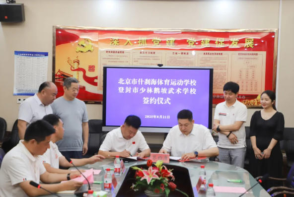 8月21日,北京市什刹海体育运动学校与登封市少林鹅坡武术学校合作签约仪式在鹅坡武校隆重举行。北京市什刹海体育运动学校校长周建东、副校长鲁雪峰,与少林鹅坡武术学校校长梁少宗、副校长王金波等双方领导共同出席了仪式。
