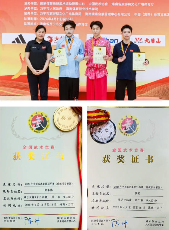 经过激烈角逐,来自鹅坡武术学校的席浩博同学获得男子双鞭冠军,穆想同学获得男子少林拳亚军,双双斩获运动健将称号;另有6名同学荣获一级运动员称号,用实力书写荣耀,为学校争光添彩。
