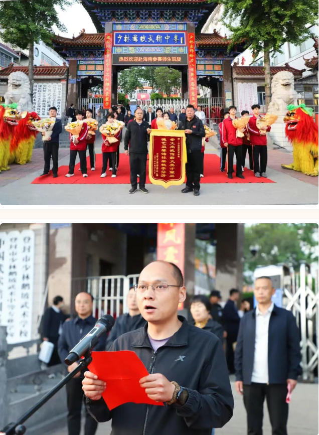 4月16日,鹅坡武校校门口喜气洋洋、掌声雷动,学校以最隆重、最热烈的欢迎仪式,迎接赴海南万宁参加2026年全国武术套路冠军赛(传统项目赛区)的师生载誉归来,欢迎仪式由副校长周洪多主持。