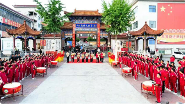仪式现场,锣鼓震天,雄狮欢腾,迎接队伍身着红色校服,整齐列队,同学们依次为参赛师生献上鲜花。