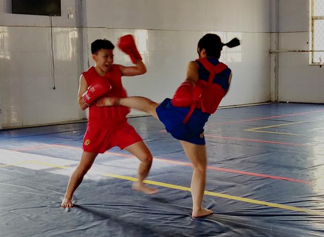 散打最大的特点是肌体方面的对抗,没有强健的体魄是很难经得起“击打”的,而达到散打强体,就要强化肌体训练,提高肩力、臂力、腕力的能量,防止发力导致的关节损伤。鹅坡女生知难而上,用高强度的练习,夯实训练效果。